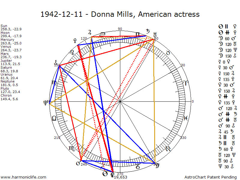 URANUS Trine-120 degrees NEPTUNE with an error of .02 degrees. Aspect strength = 99.52% Ability to present artistic talent to the world, and to perform to large audience, this is a common pairing for performers in the entertainment industry; ability to bring new ideas to the world, including new religious ideas, scientific notions, and any idea that is innovative or creative; for athletes, this is an energy and coordination enhancer to the other pairing in an M/Q, ESPECIALLY IF THE OTHER PAIRING INCLDUES Mars, Mercury, or Sun.