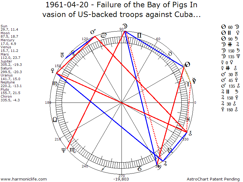 MARS (Fall) -135 degrees CHIRON with an error of 1.51 degrees. Aspect strength = 62.35% ** Turbulent Aspect ** One of the Male Sexual Aspects, it creates the ultimate high energy level, generates more pure energy than any other aspect, and rates as a Super Sports Champion Aspect (a term from Astrology Really Works!). But the Chiron -Mars aspect does not help coordination in the way the Venus-Mars aspect does. The native needs aspects that help coordination in order to most beneficially harness the energy this aspect provides. If the aspect in not well used and controlled through moral teachings, there can be constant moral slippage toward excessive aggressiveness, and even belligerency.