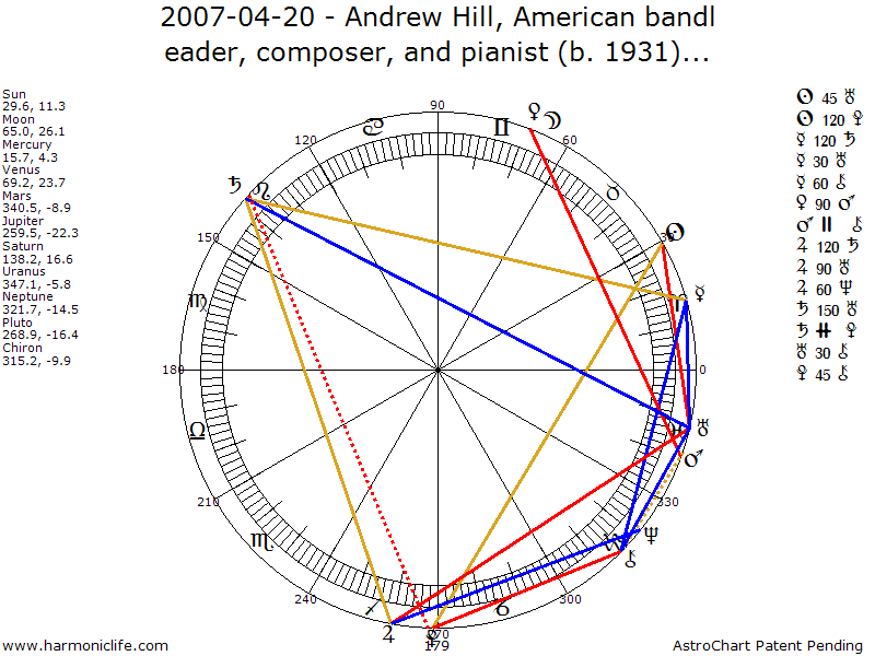 One of the Male Sexual Aspects, it creates the ultimate high energy level, generates more pure energy than any other aspect, and rates as a Super Sports Champion Aspect (a term from Astrology Really Works!). But the Chiron -Mars aspect does not help coordination in the way the Venus-Mars aspect does. The native needs aspects that help coordination in order to most beneficially harness the energy this aspect provides. If the aspect in not well used and controlled through moral teachings, there can be constant moral slippage toward excessive aggressiveness, and even belligerency.
