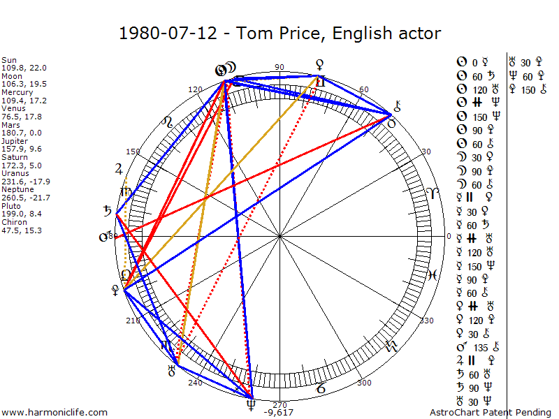 MARS (Detriment) -135 degrees CHIRON with an error of 1.76 degrees. Aspect strength = 55.90% ** Turbulent Aspect ** One of the Male Sexual Aspects, it creates the ultimate high energy level, generates more pure energy than any other aspect, and rates as a Super Sports Champion Aspect (a term from Astrology Really Works!). But the Chiron -Mars aspect does not help coordination in the way the Venus-Mars aspect does. The native needs aspects that help coordination in order to most beneficially harness the energy this aspect provides. If the aspect in not well used and controlled through moral teachings, there can be constant moral slippage toward excessive aggressiveness, and even belligerency.
