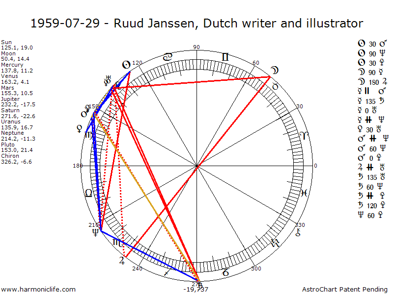 SATURN (Ruler) -135 degrees URANUS with an error of .61 degrees. Aspect strength = 84.73% The tendencies and desires are the same as before mentioned, but the subject has not the capacity and ability to direct the forces to the same successful results and meets with general misfortune through things mentioned and indicated by the houses these planets occupy. This aspect has an injurious effect on the health at some tie, weakening the parts of the body denoted by the signs occupied, especially by Saturn, producing a heavy, complicated and serious sickness, either long drawn our or else incurable. Liability to accidents by falls, falling object, collisions, acts of nature, riots or uprising and disregard for the rights for feeling of others. Mentally it gives singular, imaginative, eccentric and peculiar attitudes sudden temper, impulsive, aggressive acts. Radical or destructive tendencies. In a very weak or adverse chart, may invert the abilities and become thoroughly bad, treacher5ous, violent, or the aspect may manifest indolence, idleness, with an improvident attitude, satisfied only in catering to the tastes and emotions. Disrespect for laws.