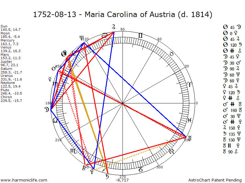 This is one of the most powerful aspects that is not a Super Aspect. It helps the native to be noteworthy and or charismatic. If the native also has a Super Aspect formed by Chiron, then he or she can have a hypnotic or mesmerizing influence on most of us. This is also a female Romance Aspect where the native (person born with the aspect), if female, has an unusually intense desire for marriage and children. Such women often marry and have children when they are very young.