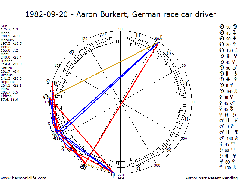 MARS (Ruler) Opposite-180 degrees CHIRON with an error of 2.4 degrees. Aspect strength = 40.01% ** Turbulent Aspect ** One of the Male Sexual Aspects, it creates the ultimate high energy level, generates more pure energy than any other aspect, and rates as a Super Sports Champion Aspect (a term from Astrology Really Works!). But the Chiron -Mars aspect does not help coordination in the way the Venus-Mars aspect does. The native needs aspects that help coordination in order to most beneficially harness the energy this aspect provides. If the aspect in not well used and controlled through moral teachings, there can be constant moral slippage toward excessive aggressiveness, and even belligerency.