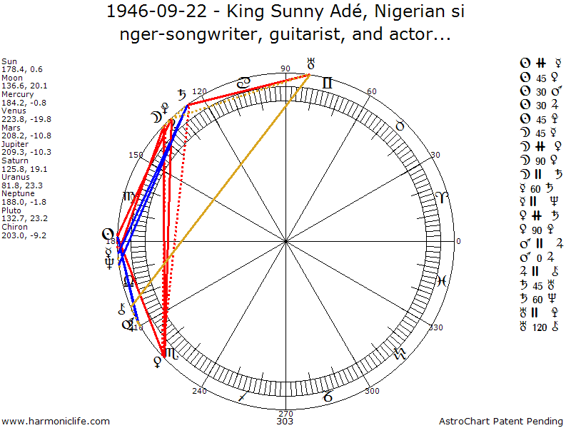 Planetary Positions: Sun 178.39 0.64 Moon 136.56 20.08 Mercury 184.24 -0.75 Venus 223.79 -19.80 Mars 208.20 -10.79 Jupiter 209.31 -10.27 Saturn 125.82 19.12 Uranus 81.78 23.26 Neptune 187.99 -1.84 Pluto 132.73 23.20 North Node 75.49 22.66 South Node 255.49 -22.66 Apogee 255.49 -22.66 Perigee 75.49 22.66 Chiron 203.02 -9.24 Pholus 292.50 -19.49 Ceres 299.11 -31.23 Pallas 270.68 10.17 Juno 215.41 -5.01