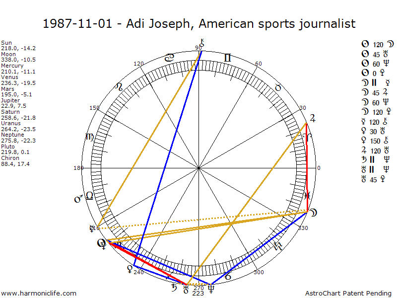 VENUS (Detriment) Semisextile-30 degrees URANUS with an error of 2.12 degrees. Aspect strength = 47.08% Loved and adored by the public; public idol; photogenic and charismatic, beautiful on screen and in print; money from sources ruled by Uranus and/or love of whatever is Uranian, including change, entertainment, broadcasting, the movies, telecommunications, publicity and fame, astrology, public performances of all kinds, space travel and flying, technology.