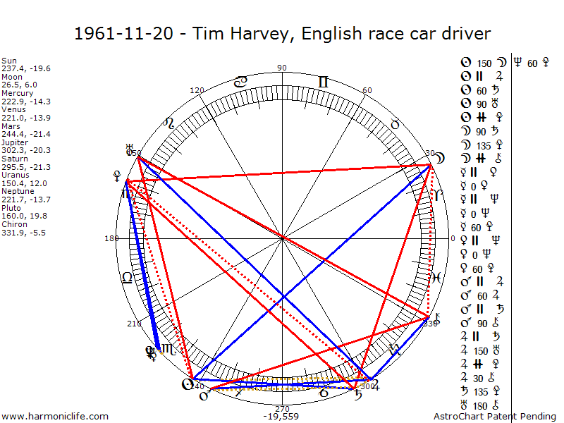 MARS Square-90 degrees CHIRON with an error of 2.47 degrees. Aspect strength = 38.13% ** Turbulent Aspect ** One of the Male Sexual Aspects, it creates the ultimate high energy level, generates more pure energy than any other aspect, and rates as a Super Sports Champion Aspect (a term from Astrology Really Works!). But the Chiron -Mars aspect does not help coordination in the way the Venus-Mars aspect does. The native needs aspects that help coordination in order to most beneficially harness the energy this aspect provides. If the aspect in not well used and controlled through moral teachings, there can be constant moral slippage toward excessive aggressiveness, and even belligerency.