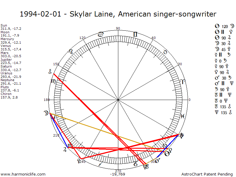 URANUS -135 degrees CHIRON with an error of .5 degrees. Aspect strength = 87.49% ** Turbulent Aspect ** This is a very powerful and helpful aspect, but unfortunately, it occurs too rarely (about every five years). It is most helpful when the native directs the aspect to achieve great fame and success in an area ruled by Chiron or Uranus. A person with this aspect has the ultimate in hypnotic charisma.
