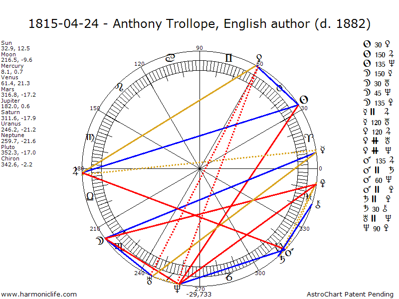 SATURN (Ruler) Semisextile-30 degrees CHIRON with an error of .98 degrees. Aspect strength = 75.61% This provides the native with the unusual ability to be a force against Judeo-Christian beliefs, morals and family values, and against marriage as an institution. This aspect also gives the native an ability to dominate the destinies of others, for better or worse. The native very often has a desire and ability to destroy marriages and break up families, and is often against the free enterprise economic system, preferring socialism or communism. Because this is a Saturn aspect, a turbulent angle can result in unconventionality. Especially in a woman, the turbulent Saturn-Chiron aspect is the Seclusion Aspect, with the native often living the last decades without a loved one. If a person has this aspect, there is far greater need to be much more careful about any involvement. In any relationship of love, a Romantic Super Linkage is required to offset this natal aspect. Please remember that all other natal aspects must be taken into account when analyzing a chart, and there could be offsetting aspects.