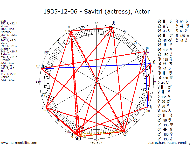 SUN Opposite-180 degrees CHIRON with an error of .68 degrees. Aspect strength = 83.06% ** Turbulent Aspect ** This is one of the most powerful aspects that is not a Super Aspect. It helps the native to be noteworthy and or charismatic. If the native also has a Super Aspect formed by Chiron, then he or she can have a hypnotic or mesmerizing influence on most of us. This is also a female Romance Aspect where the native (person born with the aspect), if female, has an unusually intense desire for marriage and children. Such women often marry and have children when they are very young.