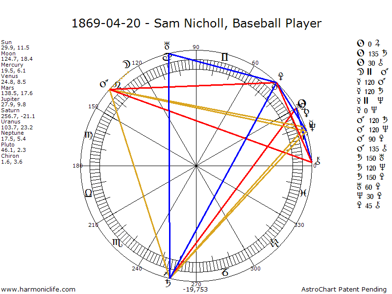 MARS -135 degrees CHIRON with an error of 1.91 degrees. Aspect strength = 52.29% ** Turbulent Aspect ** One of the Male Sexual Aspects, it creates the ultimate high energy level, generates more pure energy than any other aspect, and rates as a Super Sports Champion Aspect (a term from Astrology Really Works!). But the Chiron -Mars aspect does not help coordination in the way the Venus-Mars aspect does. The native needs aspects that help coordination in order to most beneficially harness the energy this aspect provides. If the aspect in not well used and controlled through moral teachings, there can be constant moral slippage toward excessive aggressiveness, and even belligerency.