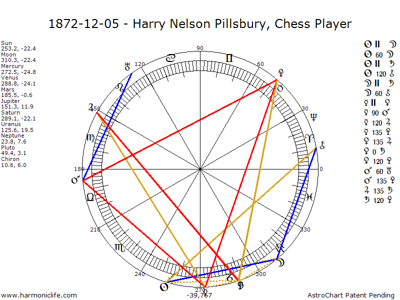 SUN Trine-120 degrees CHIRON with an error of 2.64 degrees. Aspect strength = 34.00% This is one of the most powerful aspects that is not a Super Aspect. It helps the native to be noteworthy and or charismatic. If the native also has a Super Aspect formed by Chiron, then he or she can have a hypnotic or mesmerizing influence on most of us. This is also a female Romance Aspect where the native (person born with the aspect), if female, has an unusually intense desire for marriage and children. Such women often marry and have children when they are very young.