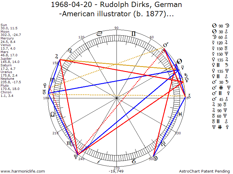 MARS (Detriment) Semisquare-45 degrees CHIRON with an error of .72 degrees. Aspect strength = 82.07% ** Turbulent Aspect ** One of the Male Sexual Aspects, it creates the ultimate high energy level, generates more pure energy than any other aspect, and rates as a Super Sports Champion Aspect (a term from Astrology Really Works!). But the Chiron -Mars aspect does not help coordination in the way the Venus-Mars aspect does. The native needs aspects that help coordination in order to most beneficially harness the energy this aspect provides. If the aspect in not well used and controlled through moral teachings, there can be constant moral slippage toward excessive aggressiveness, and even belligerency.