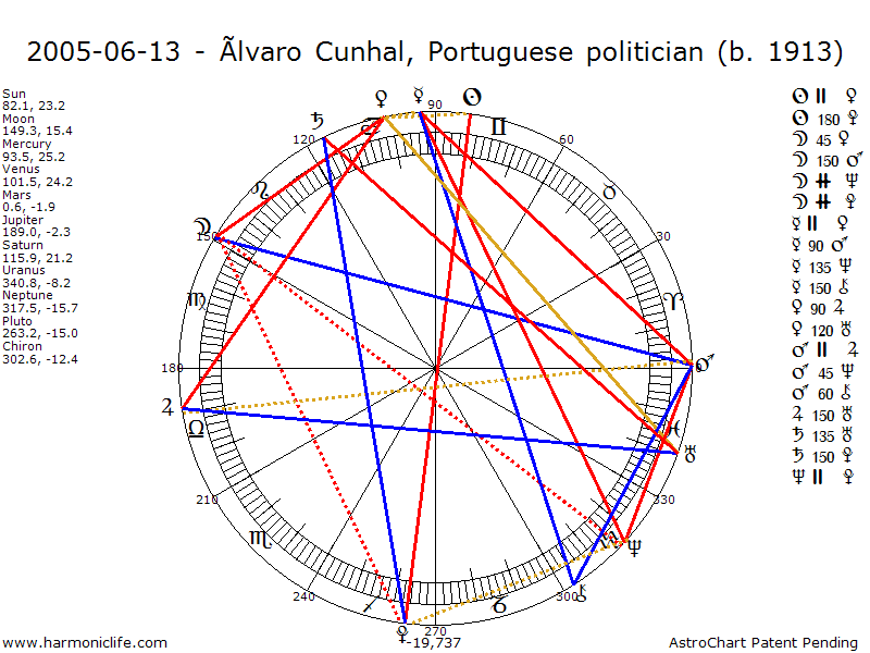 Planetary Positions: Sun 82.10 23.21 Moon 149.32 15.42 Mercury 93.52 25.22 Venus 101.45 24.16 Mars 0.63 -1.86 Jupiter 189.02 -2.30 Saturn 115.87 21.20 Uranus 340.76 -8.25 Neptune 317.45 -15.73 Pluto 263.20 -14.98 North Node 19.69 7.70 South Node 199.69 -7.70 Apogee 125.05 23.82 Perigee 305.05 -19.00 Chiron 302.58 -12.41 Pholus 237.33 2.78 Ceres 222.11 -9.32 Pallas 176.81 20.15 Juno 30.46 8.47