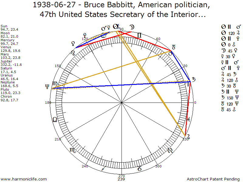 JUPITER (Ruler) Trine-120 degrees CHIRON with an error of .58 degrees. Aspect strength = 85.55% This is one of the most powerful of all aspects, as this Super Aspect provides the native with a fabulous public image and a commanding presence, which instills confidence and wins trust. It foretells a great destiny and career and can result in noteworthy success, ultimate intuitive genius, and success through charisma in anything ruled by Chiron. No matter how powerful and helpful one aspect is, though, there is no substitute for hard work, determination, and tenacity.