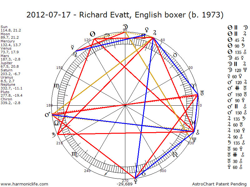 MARS (Detriment) Sesquiquadrate-150 degrees CHIRON with an error of 1.86 degrees. Aspect strength = 53.45% One of the Male Sexual Aspects, it creates the ultimate high energy level, generates more pure energy than any other aspect, and rates as a Super Sports Champion Aspect (a term from Astrology Really Works!). But the Chiron -Mars aspect does not help coordination in the way the Venus-Mars aspect does. The native needs aspects that help coordination in order to most beneficially harness the energy this aspect provides. If the aspect in not well used and controlled through moral teachings, there can be constant moral slippage toward excessive aggressiveness, and even belligerency.