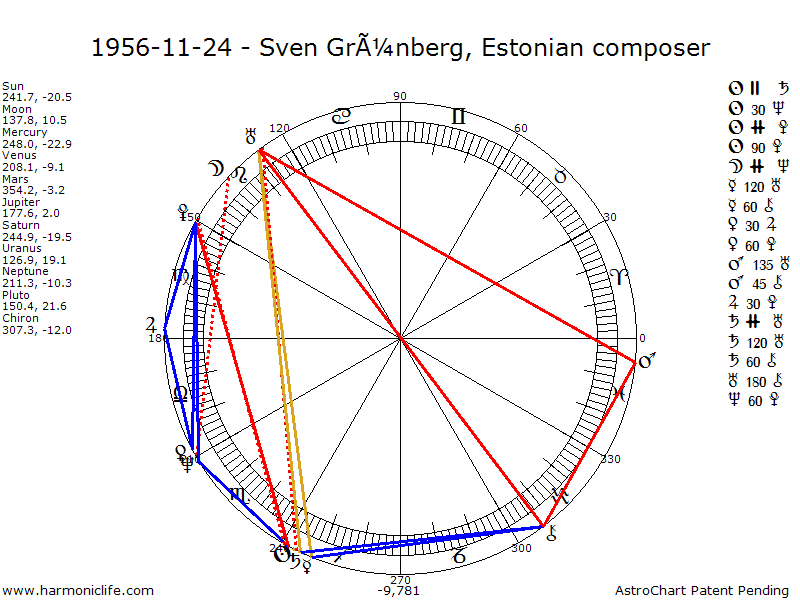 MARS Semisquare-45 degrees CHIRON with an error of 1.86 degrees. Aspect strength = 53.39% ** Turbulent Aspect ** One of the Male Sexual Aspects, it creates the ultimate high energy level, generates more pure energy than any other aspect, and rates as a Super Sports Champion Aspect (a term from Astrology Really Works!). But the Chiron -Mars aspect does not help coordination in the way the Venus-Mars aspect does. The native needs aspects that help coordination in order to most beneficially harness the energy this aspect provides. If the aspect in not well used and controlled through moral teachings, there can be constant moral slippage toward excessive aggressiveness, and even belligerency.