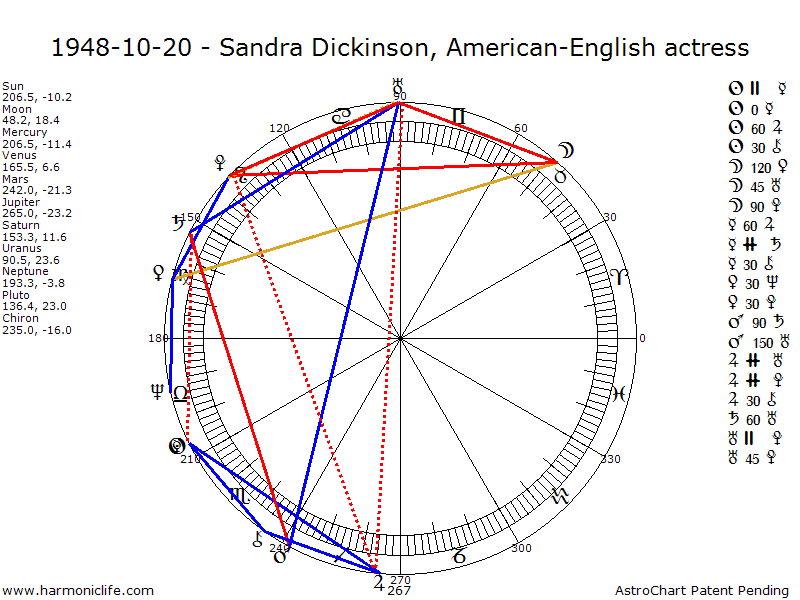 SUN (Fall) Semisextile-30 degrees CHIRON with an error of 1.56 degrees. Aspect strength = 61.11% This is one of the most powerful aspects that is not a Super Aspect. It helps the native to be noteworthy and or charismatic. If the native also has a Super Aspect formed by Chiron, then he or she can have a hypnotic or mesmerizing influence on most of us. This is also a female Romance Aspect where the native (person born with the aspect), if female, has an unusually intense desire for marriage and children. Such women often marry and have children when they are very young.
