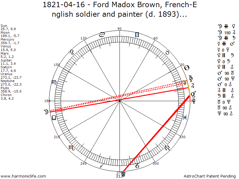 MARS (Ruler) Conjunct-0 degrees CHIRON with an error of 1.38 degrees. Aspect strength = 65.39% One of the Male Sexual Aspects, it creates the ultimate high energy level, generates more pure energy than any other aspect, and rates as a Super Sports Champion Aspect (a term from Astrology Really Works!). But the Chiron -Mars aspect does not help coordination in the way the Venus-Mars aspect does. The native needs aspects that help coordination in order to most beneficially harness the energy this aspect provides. If the aspect in not well used and controlled through moral teachings, there can be constant moral slippage toward excessive aggressiveness, and even belligerency.