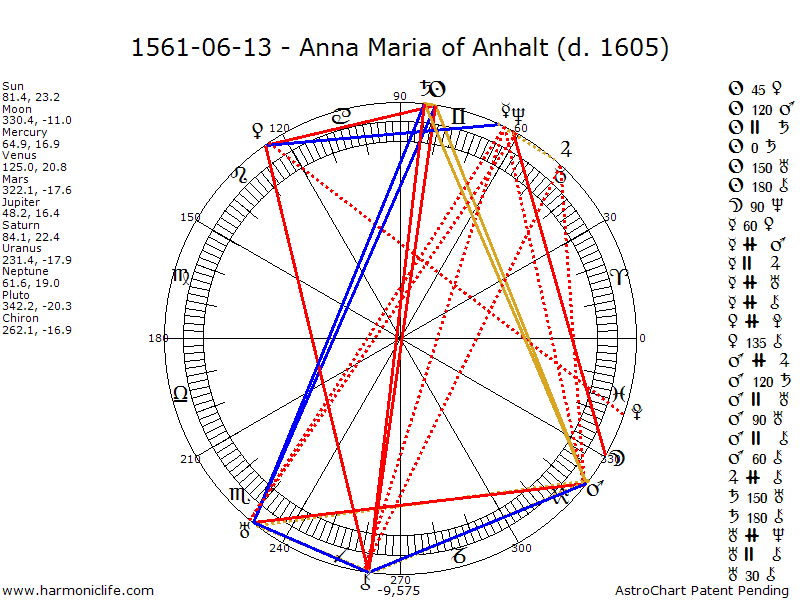 VENUS -135 degrees CHIRON with an error of 2.12 degrees. Aspect strength = 47.03% ** Turbulent Aspect ** This is a Super Aspect and the most significant Romance Aspect. Some interpretations: charismatic beauty, love of family and marriage, strong marriage and family orientation, a career involved with making money, love for the New Age and what is a part of the new Age, money from marriage and family, money from endeavors that are ruled by Chiron and what has to do with the public, and a charismatic amount of money. The native is almost always in love with being in love and therefore always needs to be in a love relationship, resulting and a tendency to fall in love too easily.