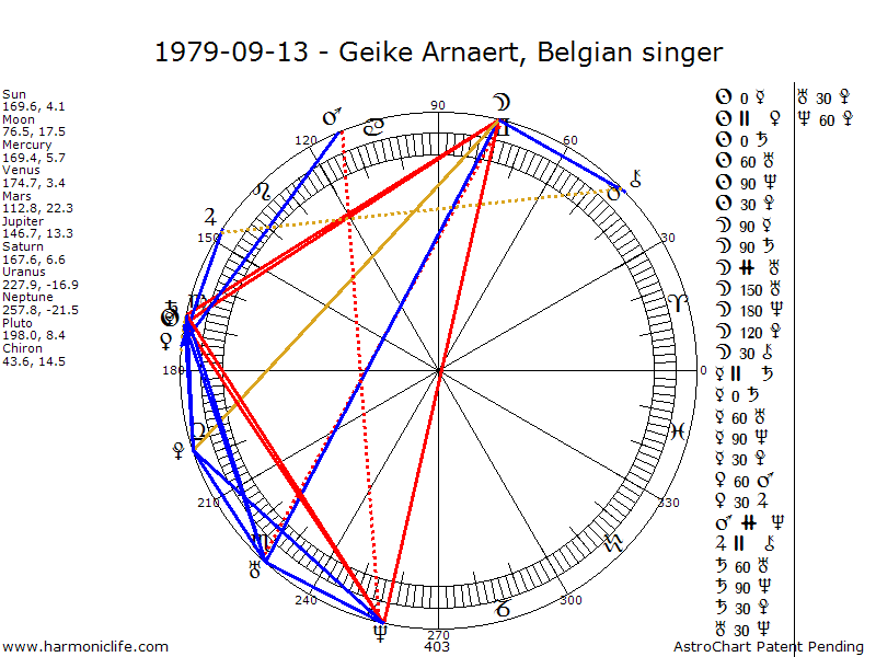 URANUS Semisextile-30 degrees NEPTUNE with an error of .14 degrees. Aspect strength = 96.40% Ability to present artistic talent to the world, and to perform to large audience, this is a common pairing for performers in the entertainment industry; ability to bring new ideas to the world, including new religious ideas, scientific notions, and any idea that is innovative or creative; for athletes, this is an energy and coordination enhancer to the other pairing in an M/Q, ESPECIALLY IF THE OTHER PAIRING INCLDUES Mars, Mercury, or Sun.