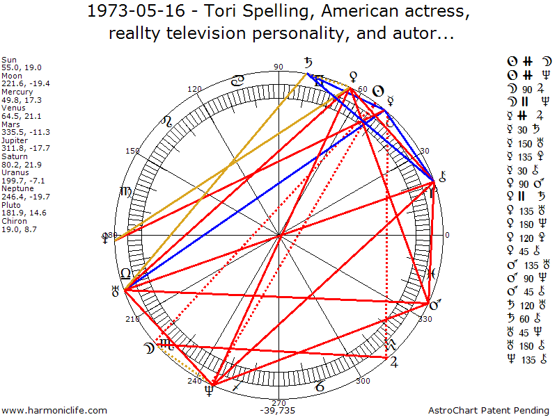 NEPTUNE -135 degrees CHIRON with an error of 2.38 degrees. Aspect strength = 40.59% ** Turbulent Aspect ** This is a Cinderella aspect. Interpretations: long-term financial security through marriage, long-term family ties, long-term charisma, lasting noteworthiness, New Age ideas and inspirations, and becoming a real live Cinderella. It works on men, also. Since Neptune is the most feminine planet, this aspect imparts a soft, feminine charisma that is very appealing. Princess Diana was born with this aspect. It is also a Romance Aspect. The native believes in real-life Cinderellas and dreams about marrying a form of royalty.