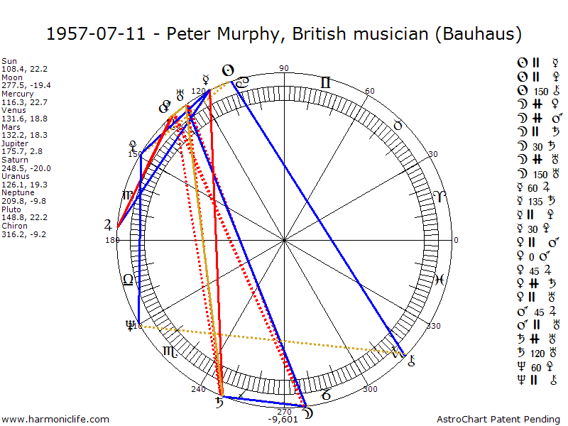 SUN Sesquiquadrate-150 degrees CHIRON with an error of 2.22 degrees. Aspect strength = 44.58% This is one of the most powerful aspects that is not a Super Aspect. It helps the native to be noteworthy and or charismatic. If the native also has a Super Aspect formed by Chiron, then he or she can have a hypnotic or mesmerizing influence on most of us. This is also a female Romance Aspect where the native (person born with the aspect), if female, has an unusually intense desire for marriage and children. Such women often marry and have children when they are very young.