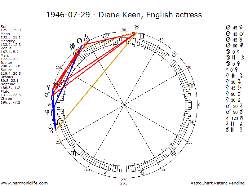 SUN (Ruler) Semisquare-45 degrees MARS with an error of 2.57 degrees. Aspect strength = 35.82% Many ups and down and obstacles in the path of the desires. Impulse, pride and anger cause many difficulties; deaths, separations, litigation and enmities; hasty, fiery temper, through not lasting; ambition, love of enterprise but not enough continuity of application, confidence, faith and patience. Outspoken, assertive, aggressive, combative, defensive, impulsive, forceful, overbearing, destructive, self-willed, headstrong, audacious and sensual. Loses the esteem of superiors and those in high position. Danger through impulsive action, assaults, quarrels, accidents, fires, fevers, inflammatory complaints, surgical operations, short sudden, sharp attacks of sickness; cuts, burns, scalds. If Mars is in Capricorn or the Sun dignified it lessens the tendency to rashness, etc…