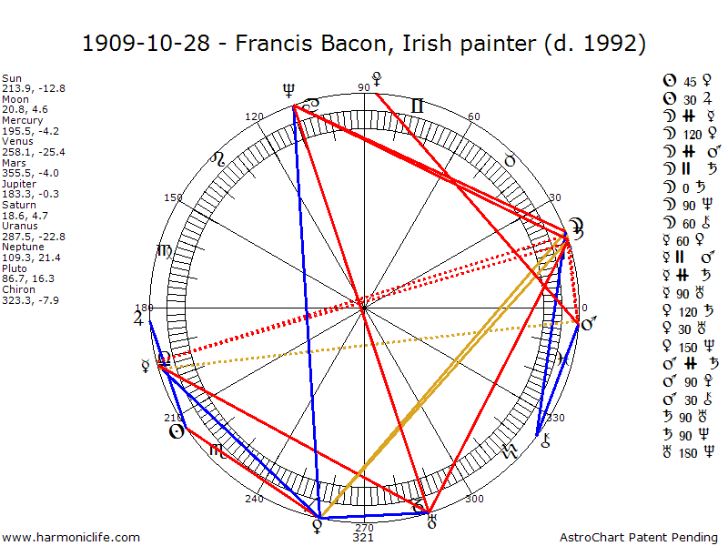 MARS Sesquiquadrate-150 degrees CHIRON with an error of .32 degrees. Aspect strength = 92.09% One of the Male Sexual Aspects, it creates the ultimate high energy level, generates more pure energy than any other aspect, and rates as a Super Sports Champion Aspect (a term from Astrology Really Works!). But the Chiron -Mars aspect does not help coordination in the way the Venus-Mars aspect does. The native needs aspects that help coordination in order to most beneficially harness the energy this aspect provides. If the aspect in not well used and controlled through moral teachings, there can be constant moral slippage toward excessive aggressiveness, and even belligerency.