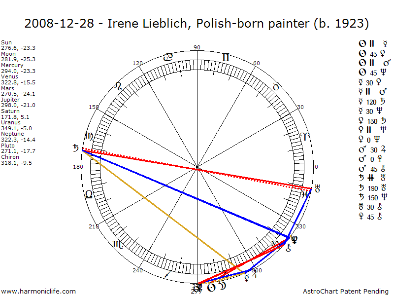 MARS Semisquare-45 degrees CHIRON with an error of 2.59 degrees. Aspect strength = 35.30% ** Turbulent Aspect ** One of the Male Sexual Aspects, it creates the ultimate high energy level, generates more pure energy than any other aspect, and rates as a Super Sports Champion Aspect (a term from Astrology Really Works!). But the Chiron -Mars aspect does not help coordination in the way the Venus-Mars aspect does. The native needs aspects that help coordination in order to most beneficially harness the energy this aspect provides. If the aspect in not well used and controlled through moral teachings, there can be constant moral slippage toward excessive aggressiveness, and even belligerency.