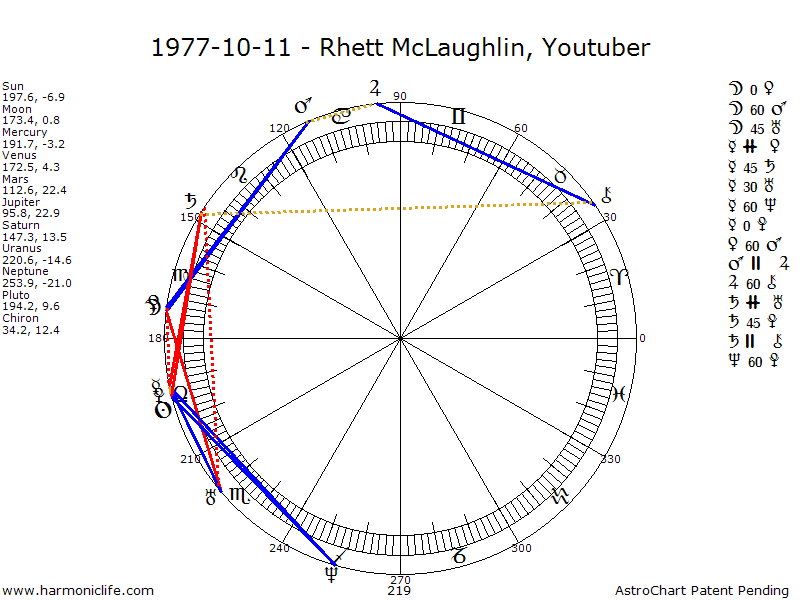 Planetary Positions: Sun 197.57 -6.90 Moon 173.40 0.81 Mercury 191.73 -3.21 Venus 172.51 4.28 Mars 112.65 22.40 Jupiter 95.85 22.94 Saturn 147.31 13.47 Uranus 220.61 -14.63 Neptune 253.95 -21.04 Pluto 194.23 9.62 North Node 194.90 -5.87 South Node 14.90 5.87 Apogee 78.94 18.37 Perigee 258.94 -22.98 Chiron 34.16 12.41 Pholus 346.39 -23.64 Ceres 222.43 -11.82 Pallas 201.96 4.55 Juno 241.41 -9.84