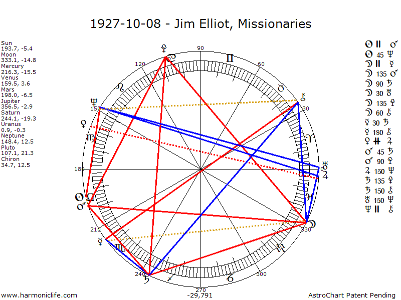 SATURN Sesquiquadrate-150 degrees CHIRON with an error of .61 degrees. Aspect strength = 84.73% This provides the native with the unusual ability to be a force against Judeo-Christian beliefs, morals and family values, and against marriage as an institution. This aspect also gives the native an ability to dominate the destinies of others, for better or worse. The native very often has a desire and ability to destroy marriages and break up families, and is often against the free enterprise economic system, preferring socialism or communism. Because this is a Saturn aspect, a turbulent angle can result in unconventionality. Especially in a woman, the turbulent Saturn-Chiron aspect is the Seclusion Aspect, with the native often living the last decades without a loved one. If a person has this aspect, there is far greater need to be much more careful about any involvement. In any relationship of love, a Romantic Super Linkage is required to offset this natal aspect. Please remember that all other natal aspects must be taken into account when analyzing a chart, and there could be offsetting aspects.