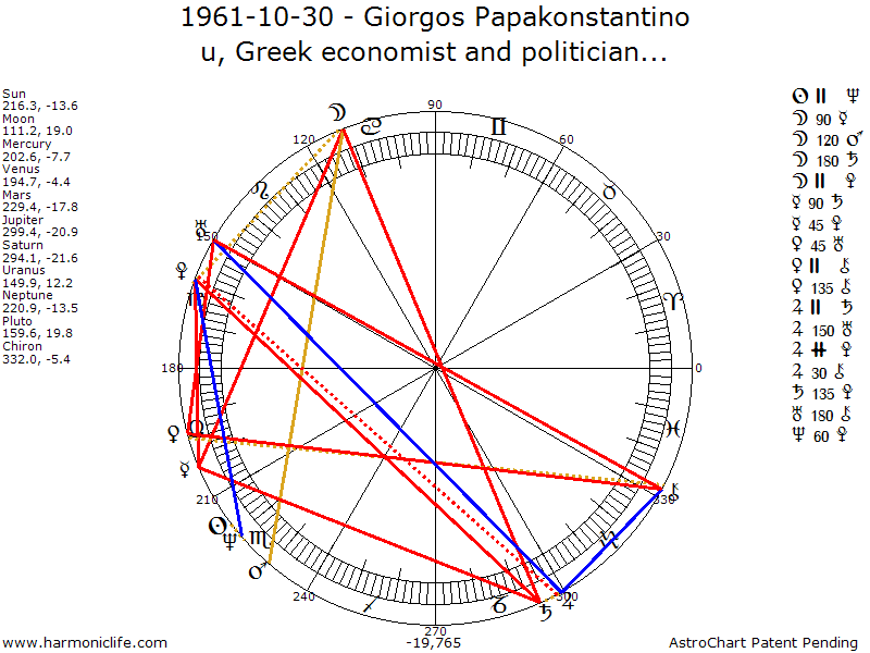 SATURN Semisextile-30 degrees CHIRON with an error of 2.15 degrees. Aspect strength = 46.32% This provides the native with the unusual ability to be a force against Judeo-Christian beliefs, morals and family values, and against marriage as an institution. This aspect also gives the native an ability to dominate the destinies of others, for better or worse. The native very often has a desire and ability to destroy marriages and break up families, and is often against the free enterprise economic system, preferring socialism or communism. Because this is a Saturn aspect, a turbulent angle can result in unconventionality. Especially in a woman, the turbulent Saturn-Chiron aspect is the Seclusion Aspect, with the native often living the last decades without a loved one. If a person has this aspect, there is far greater need to be much more careful about any involvement. In any relationship of love, a Romantic Super Linkage is required to offset this natal aspect. Please remember that all other natal aspects must be taken into account when analyzing a chart, and there could be offsetting aspects.