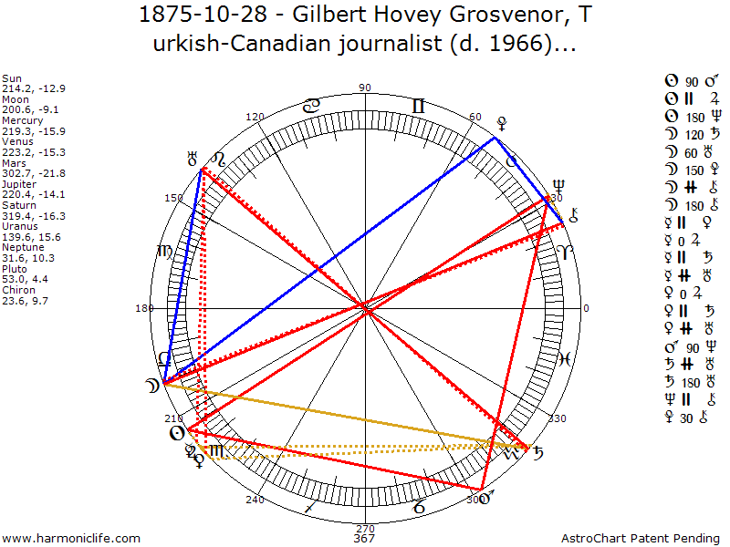 SUN Square-90 degrees MARS with an error of 1.5 degrees. Aspect strength = 62.58% Many ups and down and obstacles in the path of the desires. Impulse, pride and anger cause many difficulties; deaths, separations, litigation and enmities; hasty, fiery temper, through not lasting; ambition, love of enterprise but not enough continuity of application, confidence, faith and patience. Outspoken, assertive, aggressive, combative, defensive, impulsive, forceful, overbearing, destructive, self-willed, headstrong, audacious and sensual. Loses the esteem of superiors and those in high position. Danger through impulsive action, assaults, quarrels, accidents, fires, fevers, inflammatory complaints, surgical operations, short sudden, sharp attacks of sickness; cuts, burns, scalds. If Mars is in Capricorn or the Sun dignified it lessens the tendency to rashness, etc…