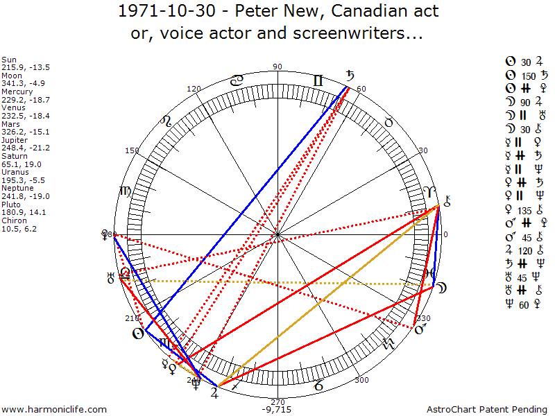 SATURN (Fall) Semisquare-45 degrees CHIRON with an error of 1.25 degrees. Aspect strength = 68.84% ** Turbulent Aspect ** This provides the native with the unusual ability to be a force against Judeo-Christian beliefs, morals and family values, and against marriage as an institution. This aspect also gives the native an ability to dominate the destinies of others, for better or worse. The native very often has a desire and ability to destroy marriages and break up families, and is often against the free enterprise economic system, preferring socialism or communism. Because this is a Saturn aspect, a turbulent angle can result in unconventionality. Especially in a woman, the turbulent Saturn-Chiron aspect is the Seclusion Aspect, with the native often living the last decades without a loved one. If a person has this aspect, there is far greater need to be much more careful about any involvement. In any relationship of love, a Romantic Super Linkage is required to offset this natal aspect. Please remember that all other natal aspects must be taken into account when analyzing a chart, and there could be offsetting aspects.