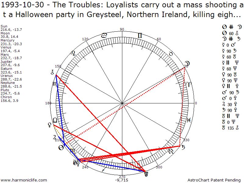 URANUS -135 degrees CHIRON with an error of 2.95 degrees. Aspect strength = 26.21% ** Turbulent Aspect ** This is a very powerful and helpful aspect, but unfortunately, it occurs too rarely (about every five years). It is most helpful when the native directs the aspect to achieve great fame and success in an area ruled by Chiron or Uranus. A person with this aspect has the ultimate in hypnotic charisma.