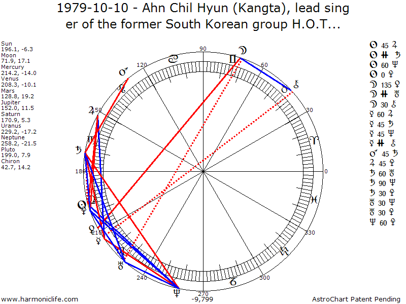 URANUS Semisextile-30 degrees NEPTUNE with an error of 1.04 degrees. Aspect strength = 74.08% Ability to present artistic talent to the world, and to perform to large audience, this is a common pairing for performers in the entertainment industry; ability to bring new ideas to the world, including new religious ideas, scientific notions, and any idea that is innovative or creative; for athletes, this is an energy and coordination enhancer to the other pairing in an M/Q, ESPECIALLY IF THE OTHER PAIRING INCLDUES Mars, Mercury, or Sun.
