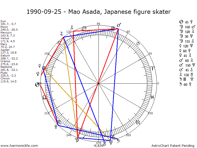 MARS Semisquare-45 degrees CHIRON with an error of .67 degrees. Aspect strength = 83.22% ** Turbulent Aspect ** One of the Male Sexual Aspects, it creates the ultimate high energy level, generates more pure energy than any other aspect, and rates as a Super Sports Champion Aspect (a term from Astrology Really Works!). But the Chiron -Mars aspect does not help coordination in the way the Venus-Mars aspect does. The native needs aspects that help coordination in order to most beneficially harness the energy this aspect provides. If the aspect in not well used and controlled through moral teachings, there can be constant moral slippage toward excessive aggressiveness, and even belligerency.