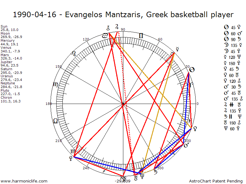 MARS -135 degrees CHIRON with an error of . degrees. Aspect strength = 99.95% ** Turbulent Aspect ** One of the Male Sexual Aspects, it creates the ultimate high energy level, generates more pure energy than any other aspect, and rates as a Super Sports Champion Aspect (a term from Astrology Really Works!). But the Chiron -Mars aspect does not help coordination in the way the Venus-Mars aspect does. The native needs aspects that help coordination in order to most beneficially harness the energy this aspect provides. If the aspect in not well used and controlled through moral teachings, there can be constant moral slippage toward excessive aggressiveness, and even belligerency.