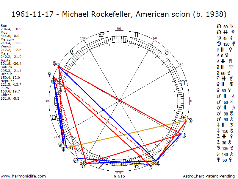 MARS Square-90 degrees CHIRON with an error of .33 degrees. Aspect strength = 91.71% ** Turbulent Aspect ** One of the Male Sexual Aspects, it creates the ultimate high energy level, generates more pure energy than any other aspect, and rates as a Super Sports Champion Aspect (a term from Astrology Really Works!). But the Chiron -Mars aspect does not help coordination in the way the Venus-Mars aspect does. The native needs aspects that help coordination in order to most beneficially harness the energy this aspect provides. If the aspect in not well used and controlled through moral teachings, there can be constant moral slippage toward excessive aggressiveness, and even belligerency.