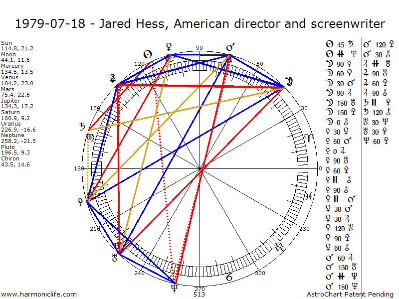MARS Semisextile-30 degrees CHIRON with an error of 1.93 degrees. Aspect strength = 51.76% One of the Male Sexual Aspects, it creates the ultimate high energy level, generates more pure energy than any other aspect, and rates as a Super Sports Champion Aspect (a term from Astrology Really Works!). But the Chiron -Mars aspect does not help coordination in the way the Venus-Mars aspect does. The native needs aspects that help coordination in order to most beneficially harness the energy this aspect provides. If the aspect in not well used and controlled through moral teachings, there can be constant moral slippage toward excessive aggressiveness, and even belligerency.