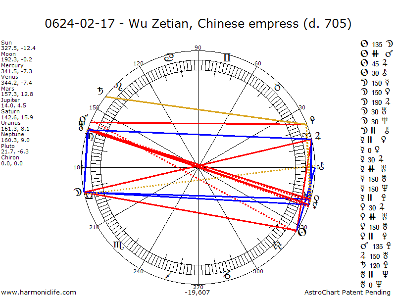 SUN (Detriment) Semisextile-30 degrees CHIRON with an error of 2.51 degrees. Aspect strength = 37.15% This is one of the most powerful aspects that is not a Super Aspect. It helps the native to be noteworthy and or charismatic. If the native also has a Super Aspect formed by Chiron, then he or she can have a hypnotic or mesmerizing influence on most of us. This is also a female Romance Aspect where the native (person born with the aspect), if female, has an unusually intense desire for marriage and children. Such women often marry and have children when they are very young.