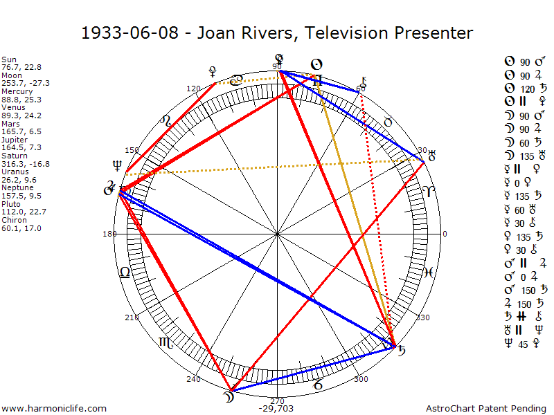 MOON -135 degrees URANUS with an error of 2.48 degrees. Aspect strength = 37.88% Unfortunate changes, journeys and removals. Impulsive, sarcastic, abrupt, peculiar, electric and independent; danger on or the near the water; trouble through the opposite sex, difficulties, annoyance and possibly separations; troubles through Occult affairs and unreliable friends. Not good for health, tending to upset the stomach and digestion, causing mental disturbance of different kinds, sudden or peculiar changes in feelings, emotions, likes and dislikes. Restless, active mind, ever desirous of new scenes, new working material and surroundings; cannot stand limitations. It usually produces extremes and reversals.