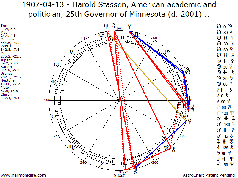 MARS Semisquare-45 degrees CHIRON with an error of 2.81 degrees. Aspect strength = 29.76% ** Turbulent Aspect ** One of the Male Sexual Aspects, it creates the ultimate high energy level, generates more pure energy than any other aspect, and rates as a Super Sports Champion Aspect (a term from Astrology Really Works!). But the Chiron -Mars aspect does not help coordination in the way the Venus-Mars aspect does. The native needs aspects that help coordination in order to most beneficially harness the energy this aspect provides. If the aspect in not well used and controlled through moral teachings, there can be constant moral slippage toward excessive aggressiveness, and even belligerency.