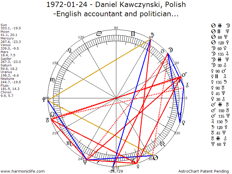 MARS (Ruler) Opposite-180 degrees URANUS with an error of .09 degrees. Aspect strength = 97.87% The subject has most of the aforementioned traits and qualities, but is somewhat over-forceful, restless and unsettled; hasty and erroneous in judgment, quick in opposition, resentful, irritable, erratic, radical, imprudent, defiant, odd, eccentric, ungovernable, rebellious, fanciful, excitable, enigmatical. Sometimes violent or revolutionary, seeking to throw off all bonds of limitation, restraint, custom and conventionality. An unfortunate aspect for affairs ruled by the signs and hoses occupied. Danger of imprisonment and liability to violence, accidents, wounds and trouble through firearms, explosions, lightning, fire, wrecks, machinery, vehicles of transportation and electrical devices. It denotes sudden and unfortunate events which upset prearranged affairs, reversal of plans and changes in objective.