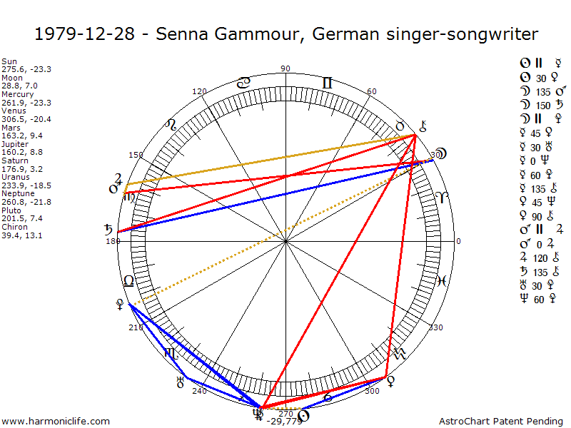 VENUS Square-90 degrees CHIRON with an error of 2.91 degrees. Aspect strength = 27.35% ** Turbulent Aspect ** This is a Super Aspect and the most significant Romance Aspect. Some interpretations: charismatic beauty, love of family and marriage, strong marriage and family orientation, a career involved with making money, love for the New Age and what is a part of the new Age, money from marriage and family, money from endeavors that are ruled by Chiron and what has to do with the public, and a charismatic amount of money. The native is almost always in love with being in love and therefore always needs to be in a love relationship, resulting and a tendency to fall in love too easily.