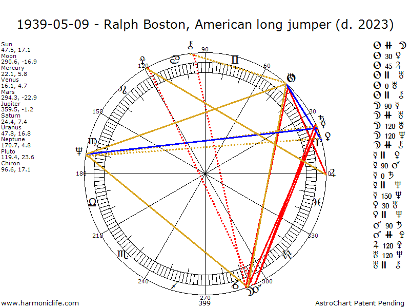 URANUS Trine-120 degrees NEPTUNE with an error of 2.88 degrees. Aspect strength = 28.03% Ability to present artistic talent to the world, and to perform to large audience, this is a common pairing for performers in the entertainment industry; ability to bring new ideas to the world, including new religious ideas, scientific notions, and any idea that is innovative or creative; for athletes, this is an energy and coordination enhancer to the other pairing in an M/Q, ESPECIALLY IF THE OTHER PAIRING INCLDUES Mars, Mercury, or Sun.