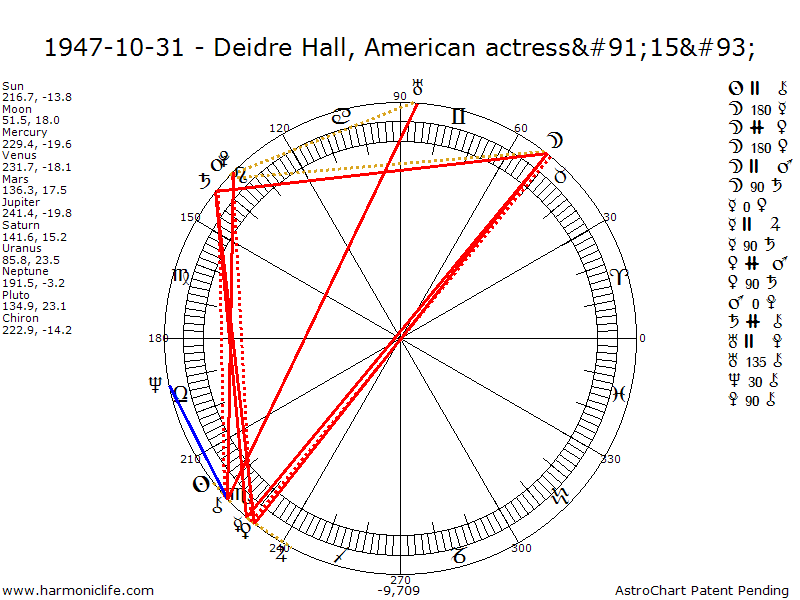 URANUS -135 degrees CHIRON with an error of 2.06 degrees. Aspect strength = 48.39% ** Turbulent Aspect ** This is a very powerful and helpful aspect, but unfortunately, it occurs too rarely (about every five years). It is most helpful when the native directs the aspect to achieve great fame and success in an area ruled by Chiron or Uranus. A person with this aspect has the ultimate in hypnotic charisma.
