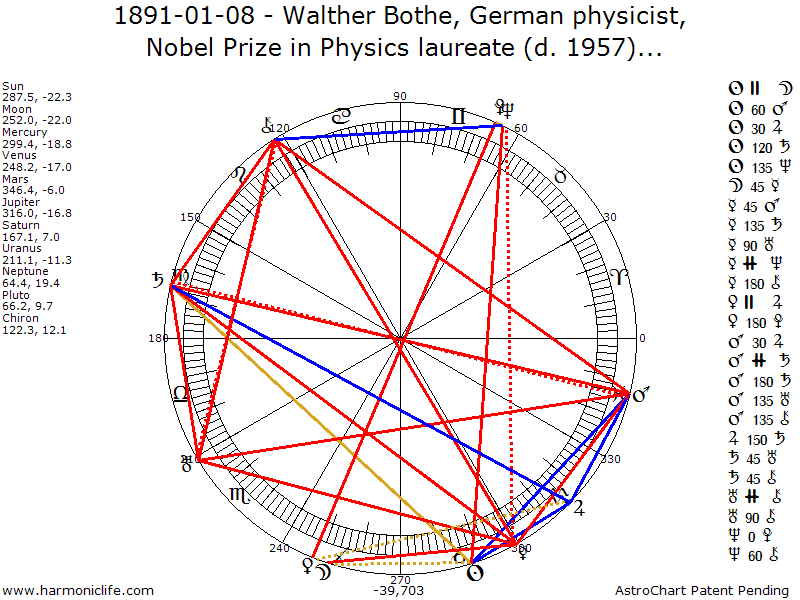 MARS -135 degrees CHIRON with an error of .89 degrees. Aspect strength = 77.68% ** Turbulent Aspect ** One of the Male Sexual Aspects, it creates the ultimate high energy level, generates more pure energy than any other aspect, and rates as a Super Sports Champion Aspect (a term from Astrology Really Works!). But the Chiron -Mars aspect does not help coordination in the way the Venus-Mars aspect does. The native needs aspects that help coordination in order to most beneficially harness the energy this aspect provides. If the aspect in not well used and controlled through moral teachings, there can be constant moral slippage toward excessive aggressiveness, and even belligerency.