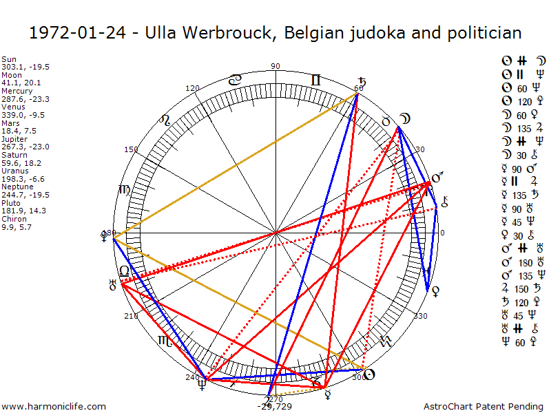 VENUS Semisextile-30 degrees CHIRON with an error of .86 degrees. Aspect strength = 78.55% This is a Super Aspect and the most significant Romance Aspect. Some interpretations: charismatic beauty, love of family and marriage, strong marriage and family orientation, a career involved with making money, love for the New Age and what is a part of the new Age, money from marriage and family, money from endeavors that are ruled by Chiron and what has to do with the public, and a charismatic amount of money. The native is almost always in love with being in love and therefore always needs to be in a love relationship, resulting and a tendency to fall in love too easily.