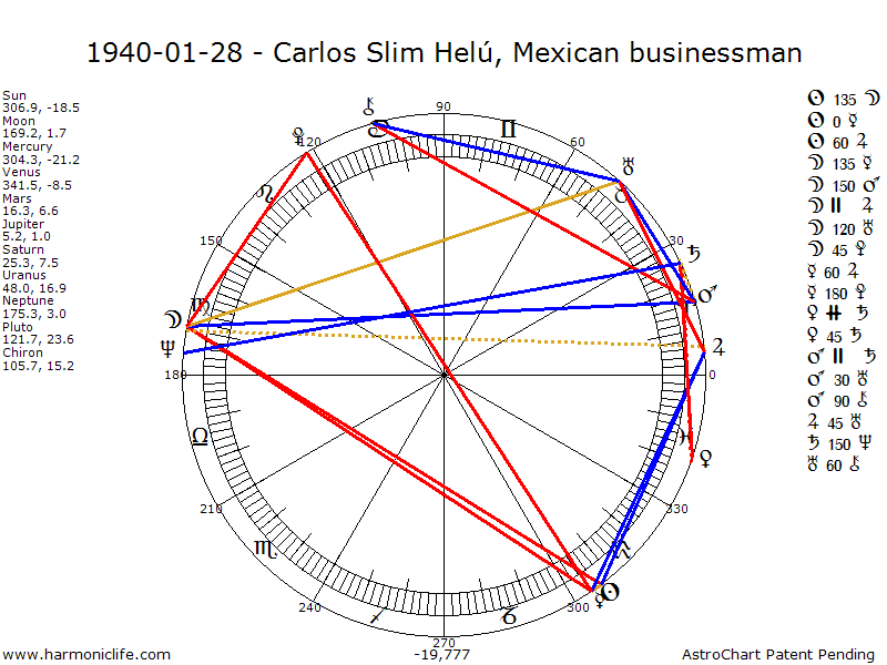 MARS (Ruler) Square-90 degrees CHIRON with an error of .63 degrees. Aspect strength = 84.34% ** Turbulent Aspect ** One of the Male Sexual Aspects, it creates the ultimate high energy level, generates more pure energy than any other aspect, and rates as a Super Sports Champion Aspect (a term from Astrology Really Works!). But the Chiron -Mars aspect does not help coordination in the way the Venus-Mars aspect does. The native needs aspects that help coordination in order to most beneficially harness the energy this aspect provides. If the aspect in not well used and controlled through moral teachings, there can be constant moral slippage toward excessive aggressiveness, and even belligerency.